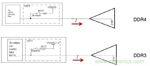 為了直觀的看出端接方式的差異對總的功耗的影響,下麵分別比較了在輸出高和低得情況下,DDR4/DDR3的電流流向。