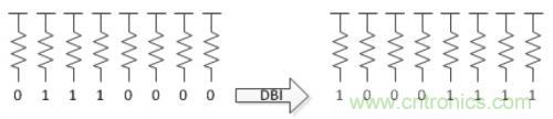所以,一個降低DDR4係統功耗的方法是,盡量加大DDR4輸出高的數量。這個就是為什麼DDR4中多了“DBI管腳”。舉個例子,當8bit lane中有至少有5個DQ都是低時,所有的Bit將會被翻轉,並且DBI(Data Bus Inversion)置低,用來指示數據線的反轉。通過這個方法,總共9個信號中(8個DQ和1個DBI),總有至少5個是被驅動為高電平。如果原始的數據中有4個或者更多的信號被驅動為高時,那麼DBI信號也將會設為高,同樣,還是9個裏麵至少有5個為高。這樣的話,在每一個數據傳輸的過程中,都是至少有5/9的數據是高電平,可以在一定程度上降低了功耗。