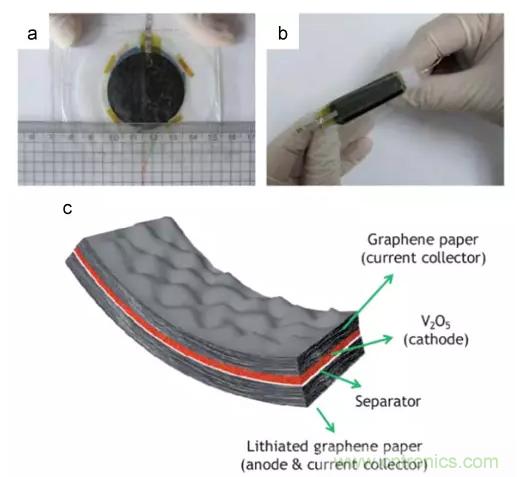 3.柔(rou)性(xing)石(shi)墨(mo)烯(xi)有(you)望(wang)製(zhi)造(zao)柔(rou)性(xing)儲(chu)能(neng)裝(zhuang)置(zhi)。使(shi)用(yong)石(shi)墨(mo)烯(xi)及(ji)其(qi)組(zu)件(jian)可(ke)以(yi)製(zhi)備(bei)出(chu)具(ju)有(you)高(gao)度(du)柔(rou)韌(ren)性(xing)的(de)集(ji)流(liu)體(ti),為(wei)我(wo)們(men)提(ti)供(gong)了(le)一(yi)種(zhong)取(qu)代(dai)脆(cui)性(xing)金(jin)屬(shu)集(ji)流(liu)體(ti)的(de)方(fang)法(fa)。此(ci)外(wai),利(li)用(yong)石(shi)墨(mo)烯(xi)還(hai)能(neng)製(zhi)備(bei)出(chu)集(ji)成(cheng)柔(rou)性(xing)電(dian)極(ji),有(you)助(zhu)於(yu)解(jie)決(jue)在(zai)反(fan)複(fu)彎(wan)曲(qu)過(guo)程(cheng)中(zhong)集(ji)流(liu)體(ti)活(huo)性(xing)材(cai)料(liao)分(fen)離(li)的(de)問(wen)題(ti)。