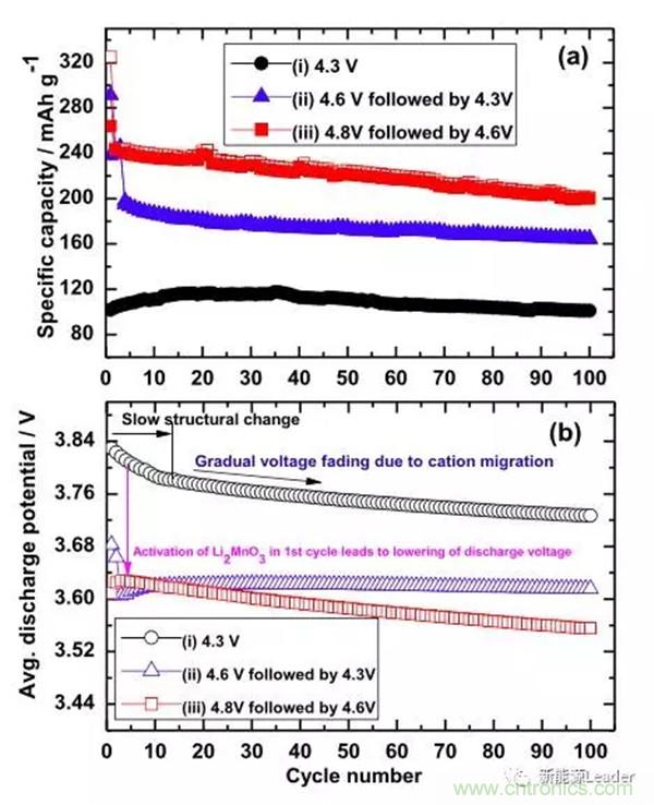 富鋰材料活化製度是影響其循環性能的一個重要因素,以色列科學家Prasant Kumar Nayak等研究顯示,活化電壓和循環電壓對於富鋰材料的循環性能都有十分顯著的影響,例如他們發現Li1.17Ni0.25Mn0.58O2在經過4.8V活化,並在2.3-4.6V之間循環的電池,雖然容量高達242mAh/g,但是循環性能很差,並且循環100次後電壓平台從3.62V衰降到了3.55V,而經過4.6V活化,並在2.3V-4.3V之間循環的電池,雖然比容量較低僅為160mAh/g,但是循環性能優異,並且循環100次未出現平台電壓衰降,如下圖所示,而沒有經過高電壓活化的材料,容量較低僅為100mAh/g左右,可見富鋰材料的活化製度和循環製度對於富鋰材料的循環具有巨大的影響。