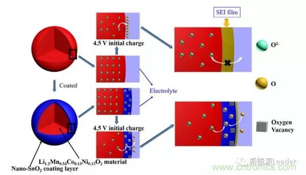 富鋰材料界麵穩定性差,容易導致副反應的發生,影響電池的循環壽命,一種有效的解決辦法就是“表麵包覆”,例如AlF3、Al2O3和Li3PO4等材料都可以用於富鋰材料的表麵包覆,改善富鋰材料的表麵穩定性。哈工大的杜春雨等等提出了一種SnO2包覆方案,他們利用了SnO2中的氧缺位,促進Li2MnO3結構的形成,不僅改善了富鋰材料的循環性能和倍率性能,還提高了富鋰的材料的容量,達到了264.6mAh/g,相比於沒有包覆處理的富鋰材料提高了38.2mAh/g,這也為富鋰材料表麵改性處理提供了一個新的思路。