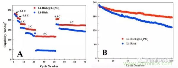 華南師範大學的Dongrui Chen等借助聚多巴胺模版法,利用Li3PO4對富鋰材料進行了包覆處理,Li3PO4包覆層的厚度僅為5nm左右。Li3PO4包覆層極大的改善了富鋰的材料的循環性能,0.2C,2.0-4.8V循環100次,容量保持率為78%,而沒有經過包覆處理的富鋰材料容量保持率僅為58%,同時Li3PO4包覆層也顯著提高了富鋰的材料的倍率性能,如下圖所示。