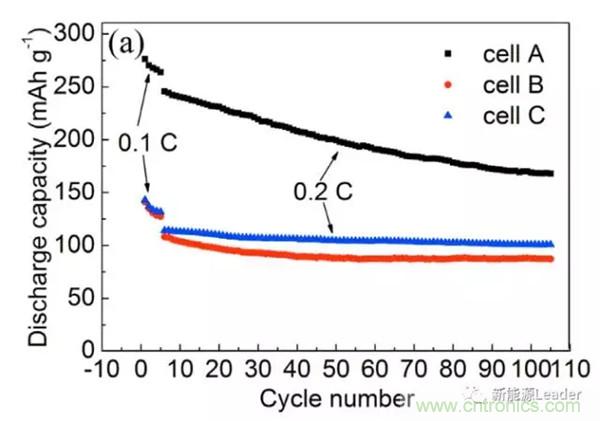富鋰材料的低溫性能也是阻礙富鋰材料應用的一個重要因素,中國工程物理研究院的Guobiao Liu等對於富鋰材料低溫下容量下降的機理做了詳細的研究,一般認為,富鋰材料在低溫下由於活化產生的Li2MnO3材料的數量較少,導致容量偏低,但Guobiao Liu的研究發現,即便是材料內的Li2MnO3含量較高,在低溫下容量發揮也很低,Li2MnO3含量並不是影響材料容量發揮的決定性因素,Guobiao Liu認為低溫下較差的電極動力學特性會抑製Mn4+/Mn3+反fan應ying,從cong而er導dao致zhi材cai料liao的de容rong量liang發fa揮hui較jiao低di。循xun環huan性xing能neng研yan究jiu顯xian示shi,雖sui然ran低di溫wen導dao致zhi富fu鋰li材cai料liao的de容rong量liang發fa揮hui較jiao低di,但dan是shi卻que顯xian著zhu的de提ti升sheng了le富fu鋰li材cai料liao的de循xun環huan性xing能neng,如ru下xia圖tu所suo示shi(電池A在25℃下循環,含有較多數量的Li2MnO3,電池B,在低溫-20℃下循環含有較少數量的Li2MnO3,電池C首先在25℃下活化,然後在-20℃下循環,含有數量較多的Li2MnO3)。A、B和C三種電池在循環100次後,容量保持率分別為68.3%、80.9%和88.1%,通tong過guo對dui三san種zhong電dian池chi中zhong的de富fu鋰li材cai料liao的de結jie構gou研yan究jiu顯xian示shi,低di溫wen很hen好hao的de抑yi製zhi了le富fu鋰li材cai料liao從cong層ceng狀zhuang結jie構gou向xiang尖jian晶jing石shi結jie構gou轉zhuan變bian,從cong而er顯xian著zhu改gai善shan了le富fu鋰li材cai料liao的de循xun環huan性xing能neng。