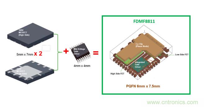 FDMF8811集成了一對100V的功率MOSFET、120 V驅動器IC和一個自舉二極管到6.0 mm x 7.5 mm 的PQFN封裝。