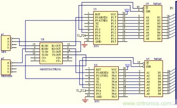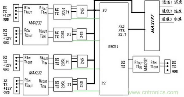 經過分析,我們分別使用一塊2051單片機接收各路串口傳感器的數據,同時使用一塊多路高精度ADC對轉換成電壓的溫度等信號采樣,係統結構圖如圖1所示。主從機之間的具體管腳連接參見圖2。