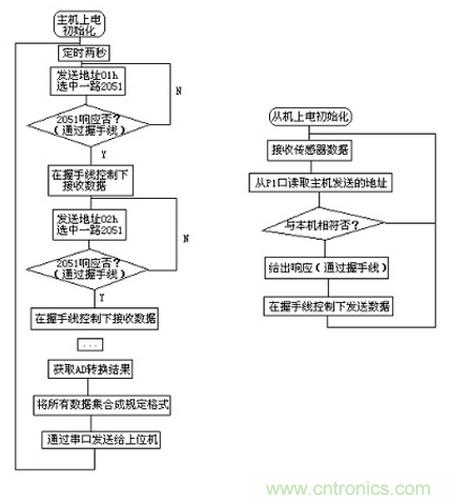 係統中51單片機作為主機控製著整個係統的動作並發起每次通信,每塊2051作為實時從傳感器獲取數據並在主機控製下完成通信。主機和各從機之間通過並口連接通信。主從機工作流程如下: