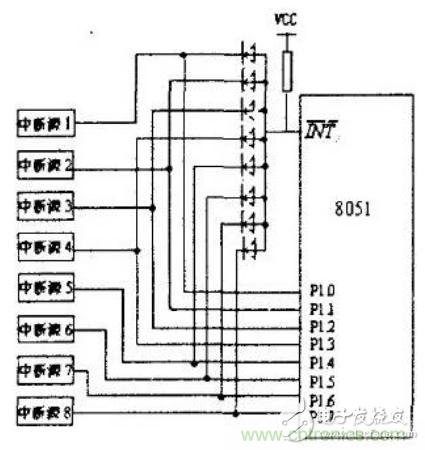 擴展的8個外部中斷源均通過二極管向I N T(x=0或I)請求中斷。當某個外部中斷源請求中斷服務時輸出低電平,單片機的I NT 經二極管接地電平,單片機滿足響應外部中斷(I N T)請求條件,響應中斷,程序立即轉向I NT 對應的中斷入口地址處開始執行中斷服務程序,通過軟件查詢PI.0~P1.7口(kou)外(wai)中(zhong)斷(duan)源(yuan)的(de)狀(zhuang)態(tai),以(yi)識(shi)別(bie)提(ti)出(chu)請(qing)求(qiu)的(de)外(wai)擴(kuo)中(zhong)斷(duan)源(yuan),並(bing)轉(zhuan)向(xiang)中(zhong)斷(duan)服(fu)務(wu)程(cheng)序(xu)為(wei)其(qi)服(fu)務(wu),其(qi)查(zha)詢(xun)順(shun)序(xu)即(ji)為(wei)外(wai)部(bu)擴(kuo)展(zhan)中(zhong)斷(duan)源(yuan)的(de)中(zhong)斷(duan)優(you)先(xian)級(ji)順(shun)序(xu)。在(zai)圖(tu)中(zhong),是(shi)選(xuan)用(yong)PI.0~PI.7作為外擴中斷源請求的狀態信息輸入端口。