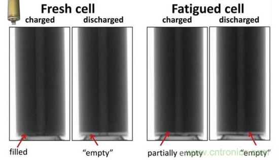 鋰離子電池主要由正極、負極、gemohedianjieye,yijijiegoujiandengbufenzucheng,zaililizidianchidewaibu,tongguodaoxianhefuzaideng,jiangfujidedianzichuandaodaozhengji,erzaidianchineibu,zhengfujizhijianzetongguodianjieyejinxinglianjie,zaifangdiandeshihou,Li+通過電解液從負極擴散到正極,嵌入到正極的晶體結構之中。所以在zai鋰li離li子zi電dian池chi中zhong,電dian解jie液ye是shi非fei常chang重zhong要yao的de一yi環huan,對dui鋰li離li子zi電dian池chi的de性xing能neng有you著zhe重zhong要yao的de影ying響xiang。理li想xiang的de情qing況kuang下xia,正zheng負fu極ji之zhi間jian應ying該gai有you充chong足zu的de電dian解jie液ye,在zai充chong放fang電dian的de過guo程cheng中zhong都dou應ying該gai具ju有you足zu夠gou的deLi+濃度,從而減小由於電解液的濃差極化造成的性能衰降。但是在實際充放電過程中,受製於Li+擴散速度等因素,在正負極會產生Li+濃度梯度,Li+濃(nong)度(du)隨(sui)著(zhe)充(chong)放(fang)電(dian)而(er)波(bo)動(dong)。由(you)於(yu)結(jie)構(gou)設(she)計(ji)和(he)生(sheng)產(chan)工(gong)藝(yi)等(deng)原(yuan)因(yin),還(hai)會(hui)導(dao)致(zhi)電(dian)解(jie)液(ye)在(zai)電(dian)芯(xin)內(nei)部(bu)的(de)分(fen)布(bu)不(bu)均(jun)勻(yun),特(te)別(bie)是(shi)在(zai)充(chong)電(dian)的(de)過(guo)程(cheng)中(zhong),隨(sui)著(zhe)電(dian)極(ji)的(de)膨(peng)脹(zhang),會(hui)在(zai)電(dian)芯(xin)的(de)內(nei)部(bu)形(xing)成(cheng)部(bu)分(fen)“幹區”,“幹區”的存在導致了能夠參與到充放電反應中的活性物質減少,引起電池內局部SoC不均勻,從而導致電池內局部老化速度加快。M.J. Mu hlbauer在研究鋰離子電池老化對Li分(fen)布(bu)的(de)影(ying)響(xiang)中(zhong)曾(zeng)發(fa)現(xian),由(you)於(yu)在(zai)充(chong)放(fang)電(dian)過(guo)程(cheng)中(zhong),正(zheng)負(fu)極(ji)極(ji)片(pian)都(dou)存(cun)在(zai)一(yi)定(ding)體(ti)積(ji)膨(peng)脹(zhang),導(dao)致(zhi)電(dian)芯(xin)也(ye)存(cun)在(zai)一(yi)定(ding)程(cheng)度(du)的(de)體(ti)積(ji)膨(peng)脹(zhang)和(he)收(shou)縮(suo),電(dian)芯(xin)會(hui)如(ru)同(tong)“呼吸”一般,反複的“吸入”和“吐出”電解液,所以不同時刻,電解液在電芯內的浸潤情況也在實時變化(如下圖所示)。