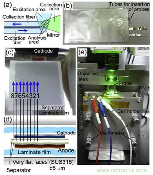 受shou限xian於yu技ji術shu手shou段duan,以yi往wang我wo們men對dui於yu在zai充chong放fang電dian過guo程cheng中zhong電dian解jie液ye在zai鋰li離li子zi電dian池chi內nei部bu的de行xing為wei缺que少shao直zhi觀guan的de認ren識shi,更geng像xiang是shi研yan究jiu一yi個ge黑hei箱xiang,我wo們men提ti出chu各ge種zhong理li論lun,對dui起qi行xing為wei進jin行xing推tui測ce。為wei了le更geng加jia形xing象xiang和he直zhi觀guan的de研yan究jiu電dian解jie液ye在zai鋰li離li子zi電dian池chi內nei的de行xing為wei特te點dian,日ri本ben京jing都dou大da學xue的deToshiro Yamanaka等[2]利用拉曼光譜工具對(dui)疊(die)片(pian)方(fang)形(xing)鋰(li)離(li)子(zi)電(dian)池(chi)進(jin)行(xing)了(le)研(yan)究(jiu),該(gai)研(yan)究(jiu)最(zui)大(da)的(de)特(te)點(dian)是(shi)實(shi)現(xian)了(le)對(dui)充(chong)放(fang)電(dian)過(guo)程(cheng)中(zhong)電(dian)解(jie)液(ye)的(de)分(fen)布(bu)和(he)電(dian)解(jie)液(ye)內(nei)離(li)子(zi)濃(nong)度(du)變(bian)化(hua)情(qing)況(kuang)的(de)實(shi)時(shi)觀(guan)測(ce)。