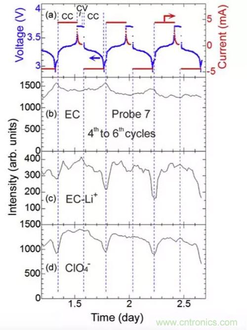 下圖展示了7號光纖探測器(電芯邊緣)在充放電過程中探測到的不同的離子濃度的變化趨勢,從結果上可以看到,在充電的過程中EC-Li+和ClO4-的濃度呈現上升趨勢,而在放電的過程中則呈現出下降的趨勢。說明隨著充電的過程,Li+從正極脫出,進入到電解液引起了電解液中Li+濃度的上升。