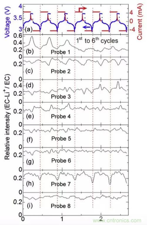 在研究Li+濃度的變化過程中,Toshiro Yamanaka還發現電解液的分布也隨著充放電而發生變化。下圖是在充放電過程中不同位置溶劑EC的強度的變化趨勢,EC的強度變化主要反映該處電解液的數量多少,隨著電芯的體積變化,電芯內的電解液分布也在不斷的發生著變化。例如在1號和2號位置,EC的濃度發生了兩次快速下降和緩慢恢複,6號探測器的位置,則出現了ECnongdudekuaisuxiajianghekuaisushangsheng,zhexiebianhuadoufanyinglelilizidianchineibuzaichongfangdianguochengzhong,youyudianjidetijipengzhang,daozhidianjieyezaidianxindejubufashengbiangan、再浸潤的過程。