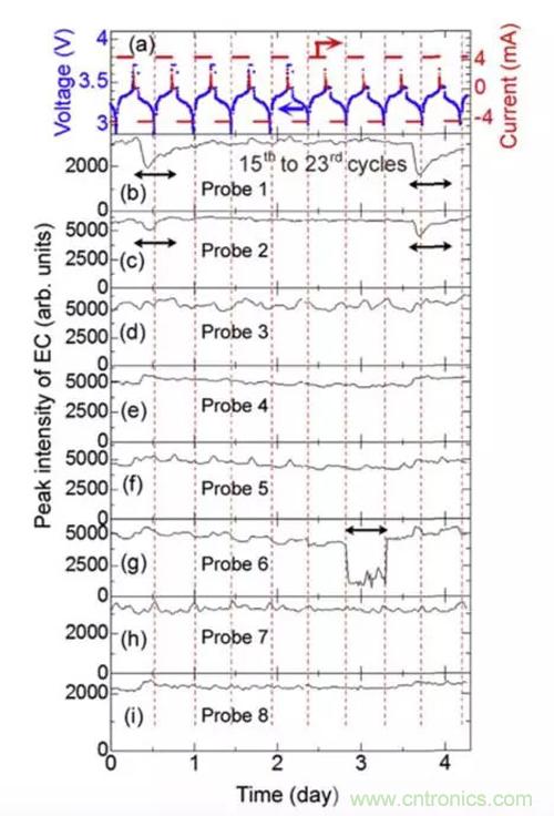 下圖則展示了8個光纖探測到的EC-Li+/EC的強度在充放電過程中的濃度變化,從下圖中可以看到,電池的不同部分EC-Li+/EC的強度變化趨勢也不相同,例如7號光纖處(電芯邊緣),EC-Li+/EC的強度隨著電池充電而增加,隨著放電而降低,而2號光纖(電芯中間)探測的結果則恰好相反,5號和6號光纖(電芯左側)處EC-Li+/EC的強度變化比較小,而1號光纖位置(電芯中央)的EC-Li+/EC的強度在前三次變化比較強烈,隨後變化開始減弱,8號光纖(電芯外部)探測器,由於在電芯的外部,因此Li+的濃度不隨著充放電而變化。說明在鋰離子電池充放電的過程中,電芯內部不同位置之間, Li+濃度變化也存在差別,Toshiro Yamanaka認為這主要是由於電池結構的不均勻造成的,例如電極之間的距離不均勻和隔膜孔隙率的不均勻。由於在Li+qianrudaozhengfujicailiaozhongdaozhidedianjitijipengzhangheshousuo,huidaozhidianjishijiazaigemoshangdeyaliyebujunyun,yinqigemoneidekongxilvfashengbianhua,gemodeliziqianyizukangyesuizhifashengbianhua,yinqigebufendeEC-Li+/EC的濃度存在差異。