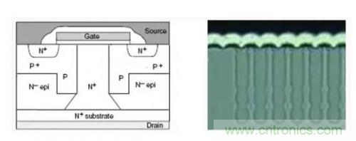 高壓的功率MOSFET的外延層對總的導通電阻起主導作用,要想保證高壓的功率MOSFET具有足夠的擊穿電壓,同時,降低導通電阻,最直觀的方法就是:在器件關斷時,讓低摻雜的外延層保證要求的耐壓等級,同時,在器件導通時,形成一個高摻雜N+區,作為功率MOSFET導通時的電流通路,也就是將反向阻斷電壓與導通電阻功能分開,分別設計在不同的區域,就可以實現上述的要求。