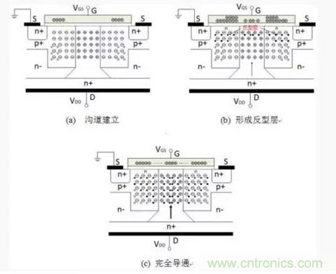 當G極加上驅動電壓時,在G極的表麵將積累正電荷,同時,吸引P區的電子到表麵,將P區表麵空穴中和,在柵極下麵形成耗盡層,如圖5示。隨著G極的電壓提高,柵極表麵正電荷增強,進一步吸引P區電子到表麵,這樣,在G極下麵的P型的溝道區中,積累負電荷,形成N型的反型層,同時,由於更多負電荷在P型表麵積累,一些負電荷將擴散進入原來完全耗盡的垂直的 N+,橫向的耗盡層越來越減小,橫向的電場也越來越小。G極的電壓進一步提高,P區更寬範圍形成N型的反型層,最後,N+區域回到原來的高滲雜的狀態,這樣,就形成的低導通電阻的電流路徑,如圖5(c)所示。