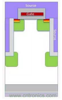 圖2顯示平麵式MOSFET情況下構成RDS(on) 的各個分量。對於低壓MOSFET,三個分量是相似的。但隨著額定電壓增加,外延層需要更厚和更輕摻雜,以阻斷高壓。額定電壓每增加一倍,維持相同的RDS(on)所需的麵積就增加為原來的五倍以上。對於額定電壓為600V的MOSFET,超過95%的電阻來自外延層。顯然,要想顯著減小RDS(on)的值,就需要找到一種對漂移區進行重摻雜的方法,並大幅減小epi電阻。