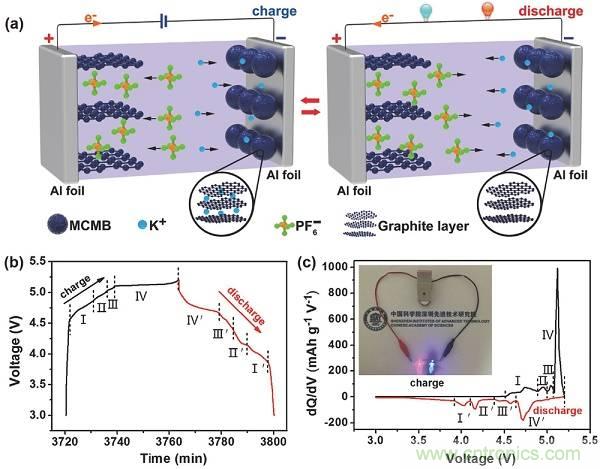 近日,中科院深圳先進技術研究院唐永炳研究員(通訊作者)課題組在Adv. Energy Mater.上發表了一篇名為“A Dual-Carbon Battery Based on Potassium-Ion Electrolyte”的文章。研究人員開發了基於鉀離子電解液的新型雙碳電池(命名為K-DCB),其中中間相碳微球作為負極材料,膨脹石墨作為正極材料。實驗人員研究了K-DCB的工作機理:充電時,K+運動到石墨負極並嵌入到石墨層間形成插層化合物,同時PF6-運動到正極,插層到中間相碳微球的層間;放電時則相反。結果表明,該K-DCB在3.0~5.2V的電壓窗口範圍,1C的電流密度下可以提供61mAh g-1的可逆比容量,並且具有良好的循環性能,循環100次後容量幾乎無衰減。此外,該K-DCB具有較高的放電中值電壓(4.5V),能夠滿足一些高電壓設備的要求。K-DCB具有環保、成本低、能量密度高等優點,對未來能源儲存應用極具潛力。
