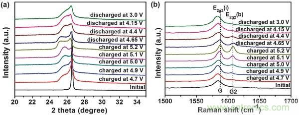 b)1C電流密度下第一次充電-放電循環過程中記錄的EG正極的非原位拉曼光譜