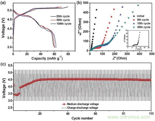 a)第20、50和100次循環過程中K-DCB的充放電曲線