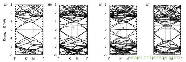 圖3.不同類型石墨烯能帶結構:(a)完整石墨烯;(b)585-V2缺陷;(c)S-W缺陷;(d)N 石墨烯