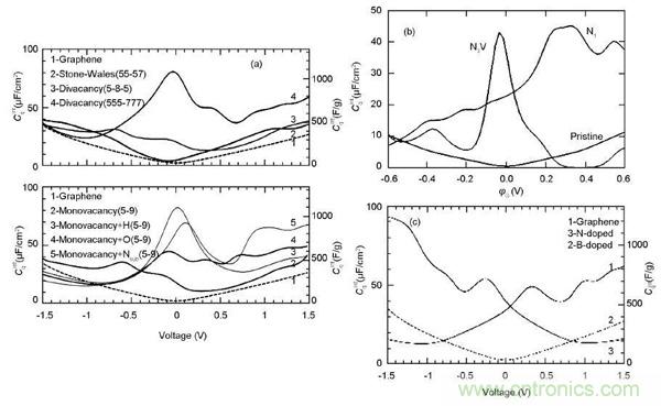 完wan整zheng的de石shi墨mo烯xi量liang子zi電dian容rong非fei常chang小xiao,在zai充chong電dian或huo放fang電dian過guo程cheng中zhong難nan以yi為wei電dian子zi提ti供gong足zu夠gou的de能neng態tai來lai存cun儲chu電dian荷he。為wei了le提ti高gao石shi墨mo烯xi的de量liang子zi電dian容rong,首shou先xian考kao慮lv到dao的de是shi在zai石shi墨mo烯xi中zhong引yin入ru缺que陷xian結jie構gou,改gai善shan石shi墨mo烯xi在zai費fei米mi能neng級ji處chu的deDOS。對於SW缺陷,由於費米能級處存在五元環和八元環碳原子上pz態組成的能帶,該能帶將會容納額外的電子,進而提高石墨烯可聚集的電量。同時,由於存在pz準局域態,V2缺陷中缺陷附近的C原子也會容納額外的電子。SW缺陷在作為負極時存儲電荷非常有效,而V2缺陷則在作為正極時表現出良好的電荷存儲行為。晶格中C原子被N和B替換後都會對量子電容產生影響,前者對正偏壓範圍內量子電容提高,後者則是對負偏壓範圍內量子電容提高。