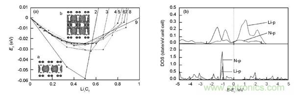 圖5.不同結構石墨烯與Li相互作用:(a)少層石墨烯; (b) Li與摻N石墨烯的態密度