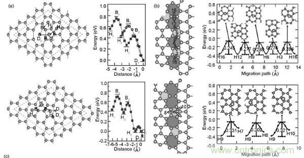 在鋰離子電池係統中,石墨烯除能夠存儲Li之外,還有一個重要的考察因素是石墨烯對Li離子擴散過程的影響,這直接影響鋰離子電池的快速充放電行為。擴散過程包括兩方麵,Li在石墨烯表麵上並以與表麵平行的方向進行擴散,另外一種是穿過石墨烯平麵,以與平麵垂直的方向擴散。