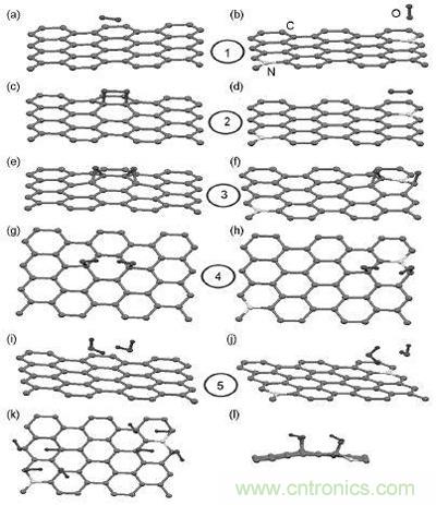 N 原子經常引入到石墨烯內部來調控其電子結構。N摻雜石墨烯可以通過含N 前驅體對石墨烯或者氧化石墨烯後處理得到缺陷點的存在會減少N摻雜的形成能,所以N在缺陷石墨烯的摻雜比完整石墨烯容易,在N 摻雜之前有意引入缺陷會提高摻雜效果。對於完整石墨烯,由於N原子之間存在排斥力,N 原子摻雜位置分布比較分散,但是當存在缺陷時,由於缺陷與N之間的吸引力,缺陷附近區域N的分布將會非常集中。