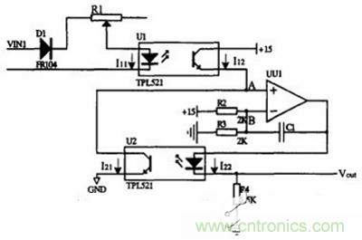 VIN 即電池單體電壓,經過R1與光耦中的發光二極管形成回路,將電壓信號(VIN)轉換為電流信號( I11)。I11與I21有一定比例關係I11∝ I21。UU1 在這裏作為比較器使用。當A點電壓Va大於B 點電壓Vb,UU1 就輸出高一些的電壓值,當A 點電壓Va低於B 點電壓Vb,UU1 就輸出低一些的電壓值。在整個電壓采樣電路中,比較器形成一個反饋。使A、B 兩點的電壓值保持一致。這樣做的目的是B 點電壓顯然是15∕2=7.5v, Va= Vb =7.5v,說明上下兩個光耦中的三極管導通情況一樣。這樣,三極管的導通情況是受控於發光二極管的。可知當I21= I22時, I11= I22。這樣,VIN∕= I11= I22= Vout∕R4。可見Vout 與VIN 成比例。