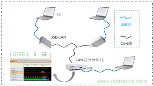 下麵進入重點,如果兩個節點ID段相同會怎樣?我們用兩個CAN卡 和一台CANScope開始實驗,CAN卡模擬CAN標準節點收發報文,CANScope做通信監控,如圖2所示。(注:CAN卡為USB轉CAN工具,CANScope為CAN總線分析儀,產品詳見ZLG致遠電子官網)