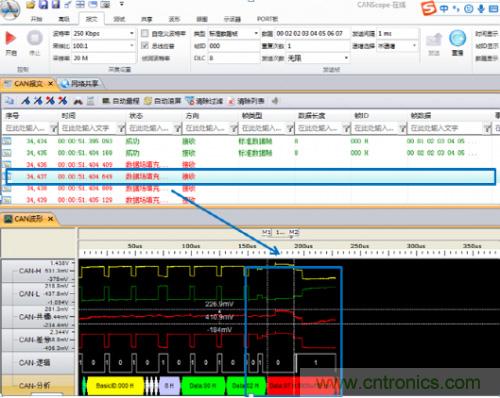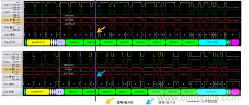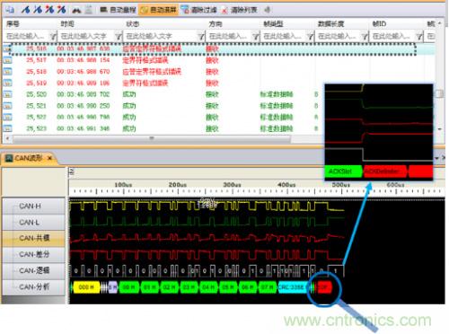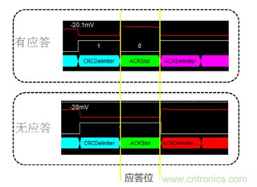 為什麼會發生這種錯誤呢?發送報文的節點會在ACK段發送兩個隱性位,若在第一個位期間接收到顯性電平則認為該幀被正確接收。由於仲裁段相同時兩節點都認為自己取得仲裁權,在ACK段等待應答,但該網絡中僅存在兩個節點,因此在ACK段不能收到應答,進而發生應答定界符錯誤。簡單說來這種情形就類似於總線中隻有一個節點將不能實現數據發送。圖7是在ACK段有無應答時的波形對比。