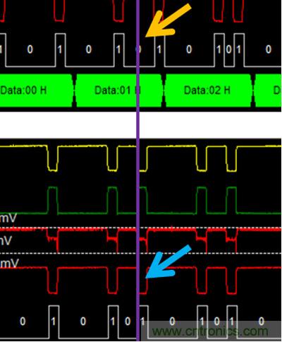 現在我們聚焦數據段,第一個字節數據相同,均為為00H;第二個字節數據不同,分別為01H、02H。圖5箭頭標示處可以看到兩者對應位的邏輯分別為0和1。前麵我們提到CAN節(jie)點(dian)在(zai)發(fa)送(song)報(bao)文(wen)的(de)同(tong)時(shi)會(hui)檢(jian)測(ce)總(zong)線(xian)電(dian)平(ping)是(shi)否(fou)與(yu)自(zi)己(ji)發(fa)送(song)的(de)電(dian)平(ping)一(yi)致(zhi),若(ruo)不(bu)一(yi)致(zhi)發(fa)生(sheng)在(zai)非(fei)仲(zhong)裁(cai)區(qu)域(yu)則(ze)觸(chu)發(fa)相(xiang)應(ying)錯(cuo)誤(wu),因(yin)此(ci)若(ruo)這(zhe)兩(liang)幀(zhen)報(bao)文(wen)同(tong)時(shi)發(fa)送(song)到(dao)總(zong)線(xian)上(shang)必(bi)將(jiang)發(fa)生(sheng)位(wei)發(fa)送(song)錯(cuo)誤(wu)。因(yin)為(wei)位(wei)發(fa)送(song)錯(cuo)誤(wu)會(hui)引(yin)起(qi)節(jie)點(dian)發(fa)送(song)違(wei)反(fan)填(tian)充(chong)規(gui)則(ze)的(de)6個顯性位(主動錯誤破壞該幀數據),故出現數據場填充錯誤,如圖3。