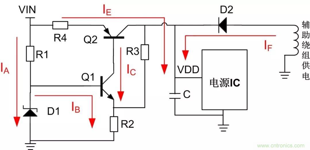 輸入電壓VIN為NPN三極管Q1提供IB電流使用它處於放大區,IC為放大電流也為PNP三極管Q2的基極電流,通過對IC電流的控製,可使Q2處於飽和狀態並以IE的飽和電流向電容C充電,直到Q2處於半截止或半飽和狀態。此時,電容就等效成一個恒流源為IC芯片提供能量,當電容電壓降到一定值時,啟動電路繼續為電容充電,直到輔助供電有電壓後,才通過電阻R2、R3之間的分壓使Q1處於截止狀態,此時啟動電路才停止工作,之後芯片的供電完全由輔助繞組提供。