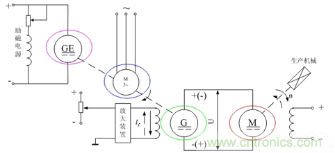 圖中,交流電動機(圖1中的藍色圈顯現)為原動機,工作時轉速基本恒定。由它拖動的直流發電機G(圖-1中的綠色圈顯現秒)給需要調速的直流電動機M(圖1中的紅色圈顯現)的電樞供電。GE(圖1中的紫色圈顯現)為一台小型直流發電機,可以如圖那樣與交流電動機、直流發電機G同軸相連,也可另設一台小型交流電動機對其拖動。它在係統中的作用是提供一小容量的直流電源,供直流發電機G(圖1中的綠色圈顯現)和直流電動機M(圖1中的紅色圈顯現)的定子勵磁用,所以又稱GE為勵磁發電機。