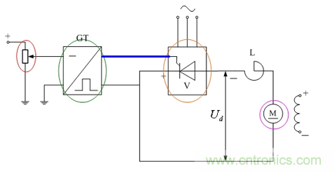 晶閘管整流裝置供電的直流調速係統如圖。GT(圖2中的綠色圈顯現)為晶閘管的觸發裝置,V(圖2中的橙色圈顯現)為晶閘管整流器,合起來為一可控直流電源。可控直流電源給直流電動機M(圖2中的紫色圈顯現)電樞供電組成直流調速係統。這類直流調速係統簡稱V-M係統。