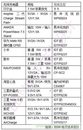 EDN電子技術設計的編輯對比了11款流行的無線充電器,整理出他們的主控芯片: