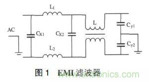 濾波是一種抑製傳導幹擾的方法, 在電源輸入端接上濾波器可以抑製來自電網的噪聲對電源本身的侵害, 也可以抑製由開關電源產生並向電網反饋的幹擾。電源濾波器作為抑製電源線傳導幹擾的重要單元, 在設備或係統的電磁兼容設計中具有極其重要的作用。電源進線端通常采用如圖1 所示的EMI 濾波器電路。該電路可以有效地抑製交流電源輸入端的低頻差模騷擾和高頻段共模騷擾。在電路中, 跨接在電源兩端的差模電容Cx1、Cx2 ( 亦稱X 電容) 用於濾除差模幹擾信號, 一般采用陶瓷電容器或聚脂薄膜電容器, 電容值通常取0.1~ 0. 47F。而中間連線接地的共模電容Cy1和Cy2 ( 亦稱Y 電容) 則用來短路共模噪聲電流, 取值範圍通常為C1=C2 # 2 200 pF。抑製電感L1、L2 通常取100~ 130H, 共模扼流圈L 是由兩股等同並且按同方向繞製在一個磁芯上的線圈組成, 通常要求其電感量L#15~ 25 mH。當負載電流渡過共模扼流圈時, 串聯在火線上的線圈所產生的磁力線和串聯在零線上線圈所產生的磁力線方向相反, 它們在磁芯中相互抵消。因此, 即使在大負載電流的情況下, 磁芯也不會飽和。而對於共模幹擾電流, 兩個線圈產生的磁場是同方向的, 會呈現較大電感, 從而起到衰減共模幹擾信號的作用。