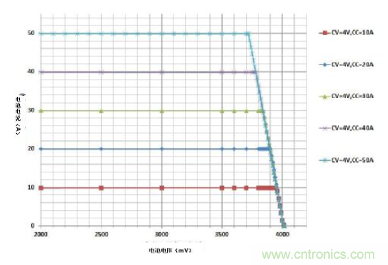 圖4顯示了在不同電流條件下,具有相同電壓設置的轉換曲線。在不同的條件下,圖4中的轉換點是不同的,因為功率傳輸路徑上的電壓降會隨著電流設置的增加而增加。圖5顯示了在不同電壓條件下,具有相同電流設置的轉換曲線。這兩條曲線顯示了從CC到CV的平滑過渡,表明控製係統是穩定的。