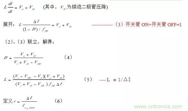 在一個連續模式的周期內,開關管打開,電感放電,根據基爾霍夫定律有: