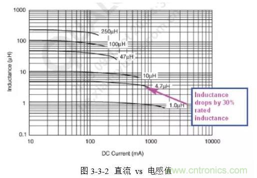 電感的飽和電流I(SAT)指其感值下降了標稱值的10%~30%所能通過的最大電流。如圖3-3-2所示,4.7uH電感下降為3.3uH時的電流約為900mA,因此其I(SAT)(30%)是900mA。