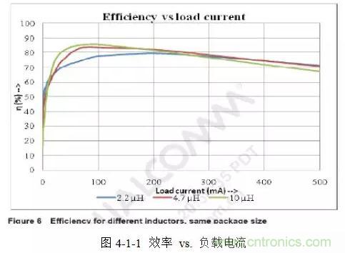 而大容量的電感具有較低的紋波電流和紋波電壓,較低的AC和傳導損失,在輕載時有較高的效率。圖4-1-1所示是Taiyo Yuden三種 2518封裝不同容量大小的電感負載電流跟效率的關係曲線。