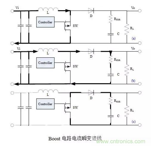 以Buck電路為例,不管開關管是由閉合-打開還是打開-閉合,電流發生瞬變的部分都如圖(c)所示,它們是會產生非常豐富的諧波分量的上升沿或下降沿。通俗的講,這些會產生瞬變的電流跡線(trace)就是所謂的“交流”(AC current),其餘部分是“直流”(DC current)。當然這裏交直流的區別不是傳統教科書上的定義,而是指開關管的PWM頻率隻是“交流”FFT變換裏的一個分量,而在“直流”裏這樣的諧波分量很低,可忽略不記。所以儲能電感屬於“直流”也就不奇怪,畢竟電感具有阻止電流發生瞬變的特性。因此,在開關電源布局時,“交流”跡線是最重要和最需要仔細考慮的地方。這也是需要牢記的唯一基本定律(only basic rule),並適用於其它法則和拓撲。下圖表示了Boost電路電流瞬變跡線,注意它和Buck電路的區別。