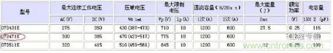 結合前麵所述,來看一下本電路中壓敏電阻的型號所對應的相關參數。