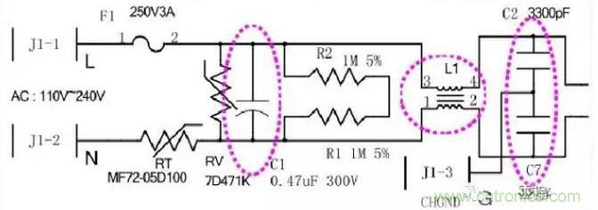 2、X電容容值選取是uF級,此時必須在X電容的兩端並聯一個安全電阻,用於防止電源線拔插時,由於該電容的充放電過程而致電源線插頭長時間帶電。 安全標準規定,當正在工作之中的機器電源線被拔掉時,在兩秒鍾內,電源線插頭兩端帶電的電壓(或對地電位)必須小於原來額定工作電壓的30%。