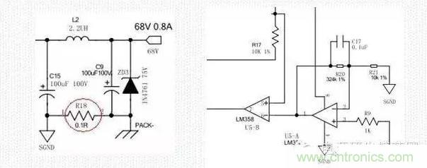 工作原理:R18為回路的電流檢測電阻,為了降低損耗,此電阻選擇時盡量的小。U5為運算放大器LM358,358內部由兩個運放,我們將兩個運放一個做放大器,一個做比較器,將檢測電阻上的電壓值放大32.4倍後與基準電壓做比較。當運放值低於基準值時,比較器輸出高電平(358VCC電壓),當運放值高於基準電壓值時,比較器輸出低電平(相對於接地).