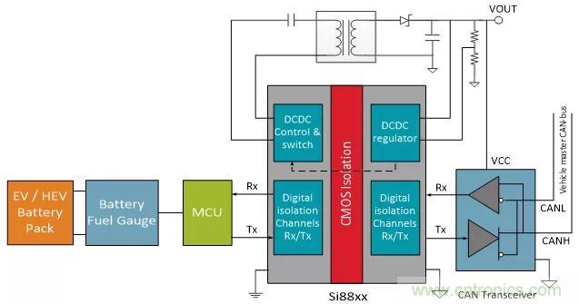 在圖3中,高壓域是電池組一側,低壓域是CAN收發器一側。此示例主要關注CAN總線接口,但微控製器(MCU)和電池組本身之間可能有額外的隔離。