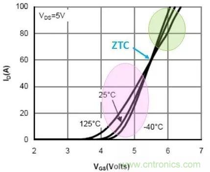 功率MOSFET的轉移特性如圖1所示,VGS與電流ID曲線有一個溫度係數為0的電壓值5.5V,通常這個點就稱為零溫度係數點ZTC(Zero Temperature Coefficient)。VGS高於5.5V時,溫度越高電流越小,功率MOSFET的RDS是正溫度係數;VGS低於5.5V時,溫度越高電流越大,功率MOSFET的的RDS是負溫度係數。