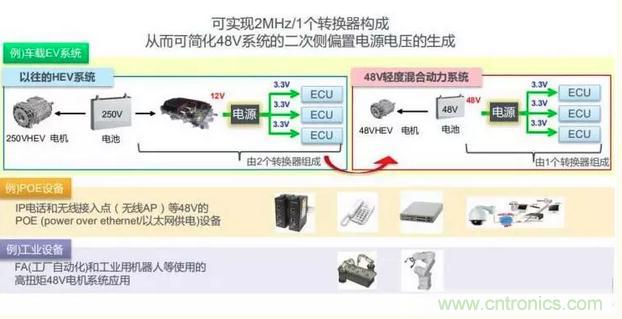 其中,一次電源主要是從48V或12V降到5V或3V,用於車載導航等。二次電源是從5V降到1.25到1V,用於ADAS(高級駕駛員輔助係統)等,未來的技術趨勢是更小封裝,開發高附加價值的電源IC。