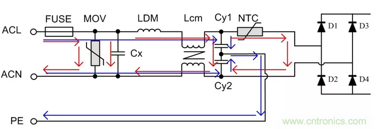 對ACL與ACN之間施加的浪湧電壓稱為差模浪湧電壓,差模路徑如圖中紅線所示;對ACL(或ACN)與PE之間施加的電壓稱為共模浪湧電壓,共模路徑如圖中藍線所示。