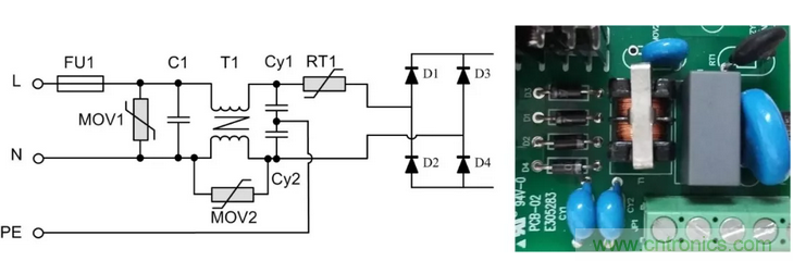 背景:以某型號的電源模塊為例,該模塊是ZLG致遠電子為某客戶定製的電源模塊,輸入85VAC~350VAC,且EMC前級電路電路嵌入到模塊中。抗浪湧要求差模電壓3KV,共模電壓6KV。更換更大的保險絲後可承受6KV差模電壓。其前級原理圖及對應實物圖如圖2所示。