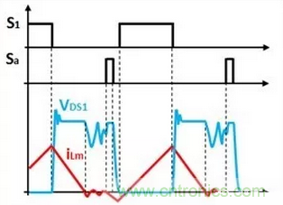 電流反灌可以使用次級輸出繞組、也可以使用輔助繞組實現原邊主開關的零電壓ZVS工gong作zuo,控kong製zhi的de方fang法fa可ke以yi使shi用yong臨lin界jie模mo式shi,也ye可ke以yi使shi用yong非fei連lian續xu模mo式shi。臨lin界jie模mo式shi的de工gong作zuo過guo程cheng以yi前qian的de文wen章zhang進jin行xing過guo詳xiang細xi的de論lun述shu,非fei連lian續xu模mo式shi的de工gong作zuo原yuan理li如ru圖tu5所示。